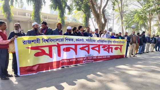 সোমবার (৬ জানুয়ারি) বেলা ১১টার দিকে বিশ্ববিদ্যালয়ের প্যারিস রোডে কর্মকর্তা, সহায়ক কর্মচারী, সাধারণ কর্মচারী, পরিবহন কর্মচারী সমিতির ব্যানারে আয়োজিত এক মানববন্ধন কর্মসূচিতে এ দাবি জানান তারা।