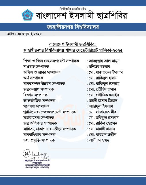 এর আগে গত ৩ জানুয়ারি জাহাঙ্গীরনগর বিশ্ববিদ্যালয় শাখার ২০২৫ সেশনের কমিটিতে সভাপতি হিসেবে মুহিবুর রহমান মুহিব এবং সেক্রেটারি হিসেবে মুস্তাফিজুর রহমানের নাম ঘোষণা করা হয়।
