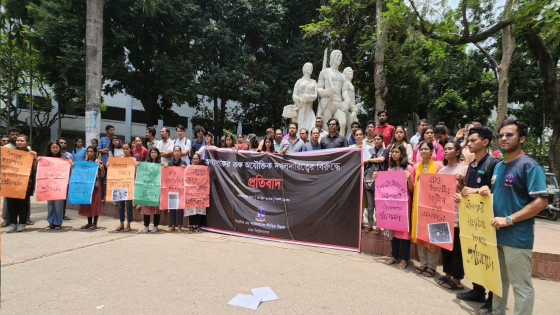 এ সময় বিভাগের শিক্ষার্থী বর্ণালী ঘোষ বলেন, এই কক্ষটি অবৈধভবে দখলের মাধ্যমে সংস্কৃতির ওপর আঘাত করা হয়েছে। আমাদের শিক্ষকরা আমাদের দেবতাতুল্য। তাদের প্রতি এ রকম লাঞ্ছনা আমরা মেনে নিতে পারছি না। আমরা এর তীব্র নিন্দা ও প্রতিবাদ জানাচ্ছি।
