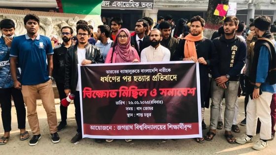 ভারতের বেঙ্গালুরুতে বাংলাদেশি নারীকে ধর্ষণের পর হত্যার প্রতিবাদে বিক্ষোভ মিছিল ও সমাবেশ করেছেন জগন্নাথ বিশ্ববিদ্যালয়ের শিক্ষার্থীরা।