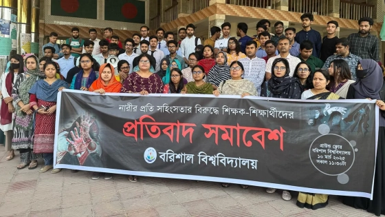 সারা দেশে চলমান ধর্ষণ ও নারীর প্রতি সহিংসতার বিরুদ্ধে বরিশাল বিশ্ববিদ্যালয়ে (ববি) শিক্ষক-শিক্ষার্থীরা প্রতিবাদ সমাবেশ করেছে।