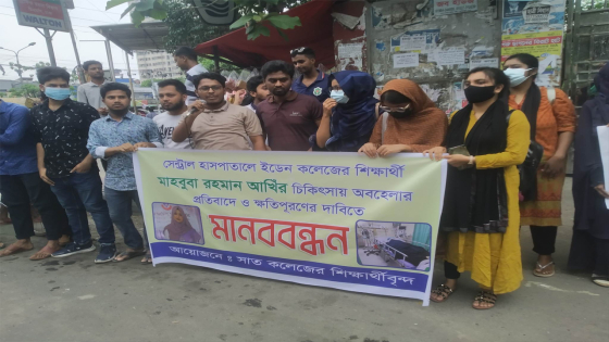 আজ বৃহস্পতিবার সকাল সাড়ে ১০টার দিকে রাজধানীর নীলক্ষেত মোড়ে সাত কলেজ শিক্ষার্থীদের আয়োজিত এক মানববন্ধনে তিনি এ দাবি করেন। আঁখিকে ভুল চিকিৎসা দেওয়ার প্রতিবাদে সরকারি সাত কলেজের শিক্ষার্থীরা এ মানববন্ধনের আয়োজন করেন।