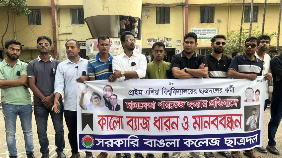প্রাইম এশিয়া বিশ্ববিদ্যালয়ের টেক্সটাইল ইঞ্জিনিয়ারিং বিভাগের শিক্ষার্থী ও ছাত্রদল নেতা জাহিদুল ইসলাম পারভেজ হত্যার প্রতিবাদে কালো ব্যাজ ধারণ ও মানববন্ধন কর্মসূচি পালন করেছে সরকারি বাঙলা কলেজ ছাত্রদল।