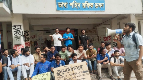 বুধবার (২৩ এপ্রিল) বিশ্ববিদ্যালয়ের ভাষা শহিদ রফিক ভবনের নিচে এ অবস্থান কর্মসূচি করেন তারা।