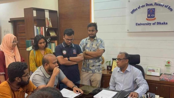 সোমবার (২৮ এপ্রিল) দুপুরে ঢাকা বিশ্ববিদ্যালয়ের কলা অনুষদের ডিন অধ্যাপক ড. ছিদ্দিকুর রহমান খানের কাছে এক স্মারকলিপিতে এসব দাবি জানান তারা। এ সময় সংগঠনটির প্রতিষ্ঠাতা তানভীর বারী হামিমসহ অন্যরা উপস্থিত ছিলেন।