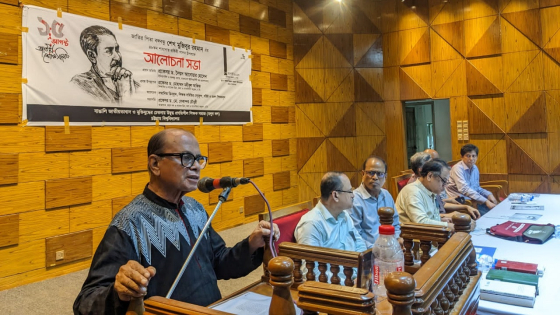 মূল প্রবন্ধ উপস্থাপক অধ্যাপক ড. মোহাম্মদ মুহিবুল আজীজ বলেন, তার (বঙ্গবন্ধু) স্বপ্নসৌধের প্রাথমিক সিঁড়িতে পা রাখা অবস্থাতেই তাকে সরিয়ে দেওয়া হয় পৃথিবী থেকে। বঙ্গবন্ধু হত্যাকাণ্ড এক সুগভীর দীর্ঘ ষড়যন্ত্রের ফল। রাষ্ট্রনায়ক হিসেবে তার সাফল্যে ভীত-শঙ্কিত এবং তার সাফল্য যাতে আর প্রভাববিস্তারী হতে না পারে সেই হীন চক্রান্তে লিপ্ত গোষ্ঠীই তার হত্যাকারী।
