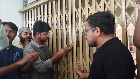 একদফা দাবিতে তৃতীয় দিনের মতো বিশ্ববিদ্যালয়ের প্রশাসনিক ভবনের নিচতলায় আজ সকাল থেকে প্রায় দুই ঘণ্টা অবস্থান কর্মসূচি গ্রহণ করেন আন্দোলনকারী শিক্ষার্থীরা। এ সময় উপাচার্যবিরোধী নানা স্লোগান দেন তারা। পরে দুপুর ১টার দিকে আরেকটি মিছিল বের করে বিশ্ববিদ্যালয় প্রশাসনের প্রতীকী কফিন নিয়ে উপাচার্যের বাসভবনের সামনে আধাঘণ্টা অবস্থান নেন বিক্ষোভকারীরা। এর আগে উপাচার্য ও ট্রেজারের কার্যালয় এবং প্রশাসনিক দপ্তরে তালা মেরে দেওয়া হয়।