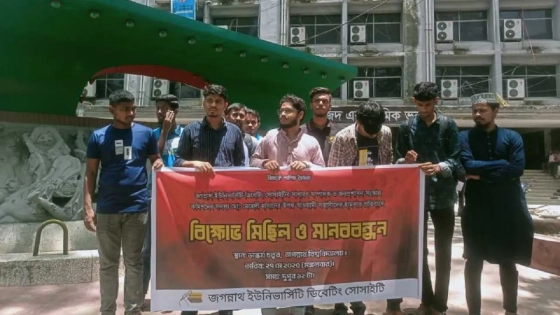 মঙ্গলবার (২৭ মে) দুপুর ১২টায় বিশ্ববিদ্যালয়ের ভাস্কর্য চত্বরে বিশ্ববিদ্যালয় ডিবেটিং সোসাইটির আয়োজনে এ কর্মসূচি পালন করেন তারা। বিক্ষোভ মিছিলটি ভাস্কর্য চত্বর শুরু করে বিশ্ববিদ্যালয় প্রাঙ্গণ প্রদক্ষিণ করে ভাস্কর্য চত্বরে মানববন্ধনের মাধ্যমে শেষ হয়।