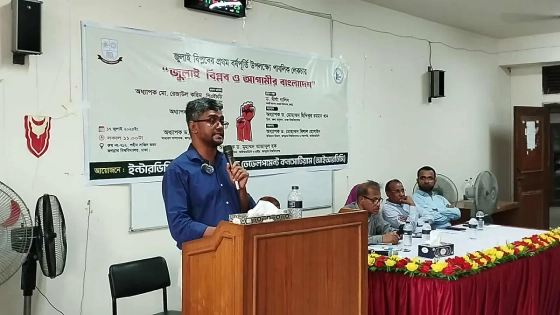 এ সময় ঢাকা বিশ্ববিদ্যালয় কলা অনুষদের ডিন, অধ্যাপক ড. মোহাম্মদ সিদ্দিকুর রহমান খান বলেন, জুলাই গণঅভ্যুত্থান হলো রাজনৈতিক অনিবার্যতা। ’৫২, ’৭১ এর আন্দোলনের ধারাবাহিকতায় আমরা ’২৪শে জুলাইয়ের আরেকটি গণঅভ্যুত্থান দেখলাম। ’২৪ এর নির্বাচনে বাঙালির ভোট দেওয়ার অধিকারকে হরণ করা হয়েছিল তাই এর চূড়ান্ত পরিণতি হলো জুলাই গণঅভ্যুত্থান। এই আন্দোলনের নেতৃত্বে ছিল যুবক, ছাত্র-ছাত্রী এবং নারীরা। এই আন্দোলনের হাত ধরে ফ্যাসিবাদ থেকে এ দেশ মুক্ত হয়েছে। আমরা গণতান্ত্রিক সমাজের উত্তরণ ঘটাতে চাই। এ আন্দোলনের সবারই মূল লক্ষ্য ছিল ফ্যাসিবাদকে পতন করা। আগামীর বাংলাদেশে আমরা প্রচলিত ধারার রাজনীতির সংস্করণ চাই।