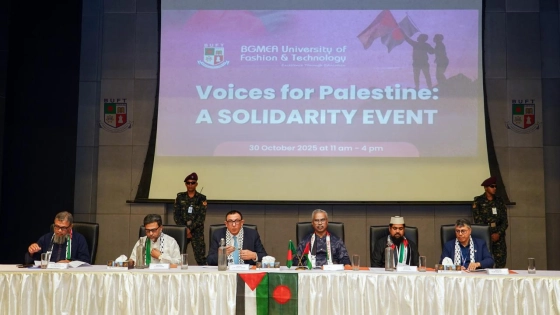প্যালেস্টাইনের প্রতি সংহতি জানাতে এবং চলমান মানবিক সংকট সম্পর্কে সচেতনতা বৃদ্ধির উদ্দেশ্যে বিজিএমইএ ইউনিভার্সিটি অব ফ্যাশন অ্যান্ড টেকনোলজি (বিইউএফটি) আয়োজন করেছে বিশেষ অনুষ্ঠান ‘ভয়েসেস ফর প্যালেস্টাইন: এ সলিডারিটি ইভেন্ট’। বৃহস্পতিবার (৩০ অক্টোবর) বিশ্ববিদ্যালয়ের স্থায়ী ক্যাম্পাসের অডিটোরিয়ামে দিনব্যাপী এ আয়োজন অনুষ্ঠিত হয়।