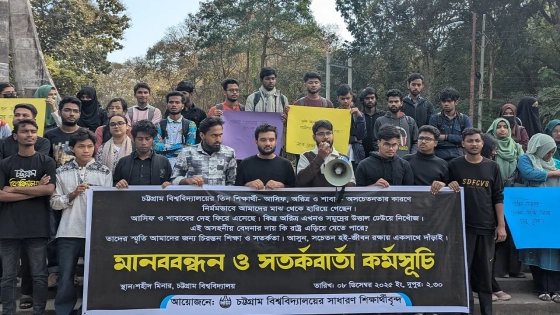 সোমবার (০৮ ডিসেম্বর) বিকাল ৩টায় শহীদ মিনার প্রাঙ্গণে ‘চট্টগ্রাম বিশ্ববিদ্যালয়ের সাধারণ শিক্ষার্থীবৃন্দ’ ব্যানারে অনুষ্ঠানের আয়োজন করা হয়।