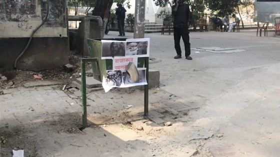জগন্নাথ বিশ্ববিদ্যালয় ক্যাম্পাসে পাকিস্তানের পতাকা অঙ্কন ও তা পদদলিত করতে বাধা দেওয়ার প্রতিবাদে রাজাকারদের প্রতি ঘৃণা প্রকাশ করে প্রতীকী ছবিতে জুতা নিক্ষেপ করেছেন বিশ্ববিদ্যালয়ের শিক্ষার্থীরা।