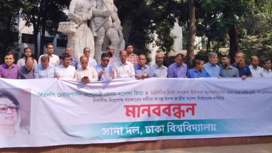 বৃহস্পতিবার (৯ নভেম্বর) দুপুরে ঢাবির অপরাজেয় বাংলার পাদদেশে আয়োজতি এক মানববন্ধন থেকে এ দাবি জানানো হয়।