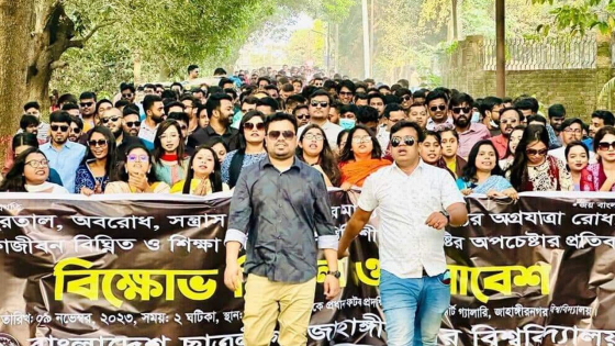 বিএনপি-জামায়াতের হরতাল, অবরোধ ও সহিংসতার প্রতিবাদে বিক্ষোভ মিছিল করেছেন জাহাঙ্গীরনগর বিশ্ববিদ্যালয় (জাবি) শাখা ছাত্রলীগের নেতাকর্মীরা। বৃহস্পতিবার (৯ নভেম্বর) বিকেল ৩টায় বিশ্ববিদ্যালয়ের প্রধান ফটক ডেইরি গেট থেকে মিছিল শুরু করেন তারা। মিছিলটি ঢাকা-আরিচা মহাসড়ক দিয়ে জয়বাংলা গেট হয়ে চৌরঙ্গী এলাকায় গিয়ে সমাবেশের মধ্য দিয়ে শেষ হয়।