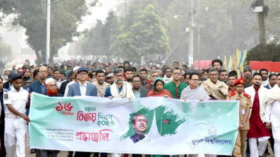 যথাযথ মর্যাদা ও বিপুল উৎসাহ-উদ্দীপনার মধ্য দিয়ে আজ ১৬ ডিসেম্বর (শনিবার) উৎসবমুখর পরিবেশে খুলনা বিশ্ববিদ্যালয়ে (খুবি) মহান বিজয় দিবস উদ্যাপন হচ্ছে। দিবসটি উপলক্ষে সকাল সাড়ে ৬টায় বিশ্ববিদ্যালয়ের শহীদ তাজউদ্দীন আহমদ ভবনের সম্মুখে উপাচার্য প্রফেসর ড. মাহমুদ হোসেন জাতীয় পতাকা উত্তোলন করেন। এরপর উপাচার্যের নেতৃত্বে বিশ্ববিদ্যালয়ের শিক্ষক, শিক্ষার্থী, কর্মকর্তা, কর্মচারীরা শোভাযাত্রাসহ ক্যাম্পাসে মুক্তিযুদ্ধের ভাস্কর্য অদম্য বাংলা চত্বর পৌঁছান।