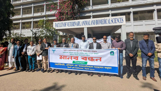 মঙ্গলবার (১৯ ডিসেম্বর) বিশ্ববিদ্যালয়ের ভেটেরিনারি অনুষদ ভবনের সামনের সড়কে এ মানববন্ধন ও বিক্ষোভ সমাবেশ অনুষ্ঠিত হয়। মানববন্ধন শেষে সংবাদ সম্মেলনে করেন বিশ্ববিদ্যালয়ের ভেটেরিনারি অনুষদের শিক্ষক শিক্ষার্থীরা।