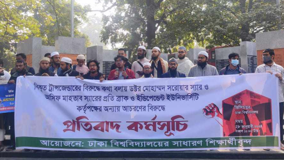 সপ্তম শ্রেণির পাঠ্যবইয়ে শরিফ-শরীফার গল্প অন্তর্ভুক্তির প্রতিবাদ জানানোর পর শিক্ষক ড. মোহাম্মদ সারোয়ার হোসেন ও আসিফ মাহতাব উৎসকে তাদের প্রতিষ্ঠানে পাঠদান থেকে বিরত থাকতে বলায় ও কর্তৃপক্ষের অন্যায় আচরণের বিরুদ্ধে ঢাকা বিশ্ববিদ্যালয়ে (ঢাবি) প্রতিবাদ কর্মসূচি পালিত হয়েছে।