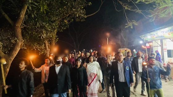 ধর্ষণে জড়িতদের বিচার দাবিসহ ৫ দফা দাবিতে অষ্টম দিনের মতো আন্দোলন চালিয়ে যাচ্ছেন জাহাঙ্গীরনগর বিশ্ববিদ্যালয়ের শিক্ষক-শিক্ষার্থীরা। রোববার (১১ ফেব্রুয়ারি) সন্ধ্যা ৭টায় নিপীড়নবিরোধী মঞ্চের ব্যানারে বিশ্ববিদ্যালয়ের শহীদ মিনার থেকে একটি মশাল মিছিল বের করেন তারা।