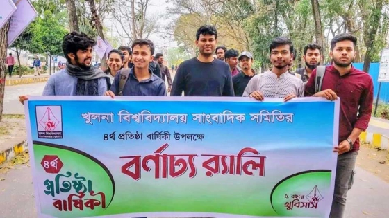 খুলনা বিশ্ববিদ্যালয় সাংবাদিক সমিতির (খুবিসাস) চতুর্থ প্রতিষ্ঠাবার্ষিকী পালিত হয়েছে। রোববার (২৫ ফেব্রুয়ারি) সকাল ১১টায় বিশ্ববিদ্যালয়ের অদম্য বাংলার সামনে থেকে র্যালির মাধ্যমে এ আয়োজন শুরু হয়।