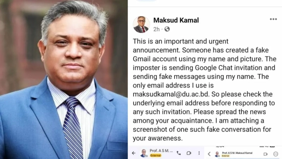 ঢাকা বিশ্ববিদ্যালয়ের (ঢাবি) উপাচার্য অধ্যাপক ড. এ এস এম মাকসুদ কামালের নামে ভুয়া জিমেইল অ্যাকাউন্ট খুলে পরিচিত ও গুরুত্বপূর্ণ ব্যক্তিবর্গকে ভুয়া বার্তা পাঠিয়ে বিভ্রান্ত করছে একটি প্রতারক চক্র।