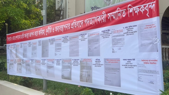 এছাড়াও বিভিন্ন অনুষদের দেয়ালে দেয়ালে শিক্ষকদের ওপর বহিরাগত ও অছাত্র নিয়ে প্রক্টর (ভারপ্রাপ্ত) কাজী ওমর সিদ্দিকীর হামলার ছবি ঝুলতে দেখা গেছে। শিক্ষকরা এটাকে ‘পদত্যাগপত্র প্রদর্শনী’ হিসেবে আখ্যায়িত করছেন।
