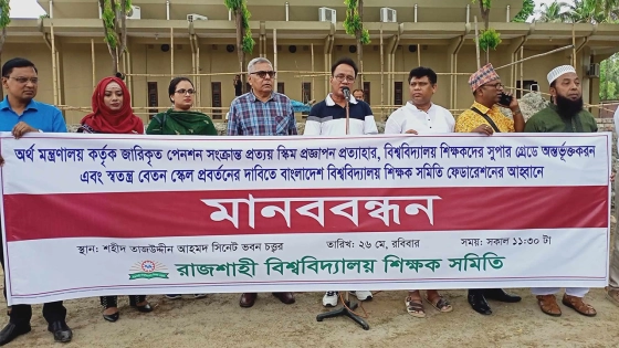 দেশের স্বায়ত্তশাসিত বিশ্ববিদ্যালয়ের শিক্ষক-কর্মকর্তা, কর্মচারীদের সর্বজনীন পেনশনসংক্রান্ত ‘প্রত্যয় স্কিম’ বাতিলের দাবি জানিয়েছে রাজশাহী বিশ্ববিদ্যালয় (রাবি) শিক্ষক সমিতি। রোববার (২৬ মে) বেলা সাড়ে ১১টার দিকে বিশ্ববিদ্যালয়ের শহীদ তাজউদ্দীন আহমদ সিনেট ভবনের সামনে আয়োজিত এক মানববন্ধন কর্মসূচি থেকে এ দাবি জানান তারা।