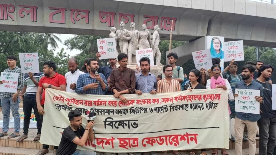কোটা পুনর্বহালের রায় স্থগিত করে যৌক্তিক সংস্কার ও শিক্ষা খাতে জিডিপির ৬ শতাংশ বরাদ্দের দাবিতে ঢাকা বিশ্ববিদ্যালয়ে (ঢাবি) বাংলাদেশ ছাত্র ফেডারেশনের বিক্ষোভ সমাবেশ অনুষ্ঠিত হয়েছে।
