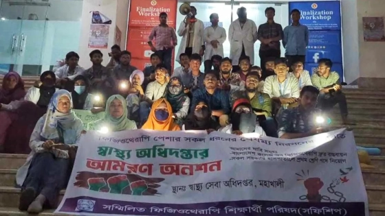 বাংলাদেশ কলেজ অব ফিজিওথেরাপি দ্রুত বাস্তবায়ন ও সব সরকারি হাসপাতালে প্রথম শ্রেণির পদ নিয়োগের দাবিতে সারাদিন অনশন পালন করেছে সম্মিলিত ফিজিওথেরাপি শিক্ষার্থী পরিষদ। তবে এ নিয়ে স্বাস্থ্য অধিদপ্তরের আলোচনা করার আশ্বাসে দুদিনের জন্য আন্দোলন স্থগিত করেছে তারা।