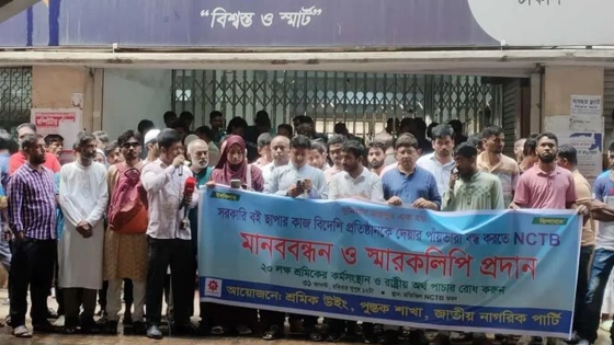 রোববার (৩১ আগস্ট) রাজধানীর মতিঝিলে এনসিটিবি কার্যালয়ের সামনে মানববন্ধন করে সংগঠনটি এই হুঁশিয়ারি দেয়। মানববন্ধনে নেতাকর্মীরা বিদেশি ছাপা চাই না, দুনিয়ায় মজদুর এক হও লড়াই করো, বিদেশি কালো হাত ভেঙে দাও সহ নানা স্লোগান দেন।