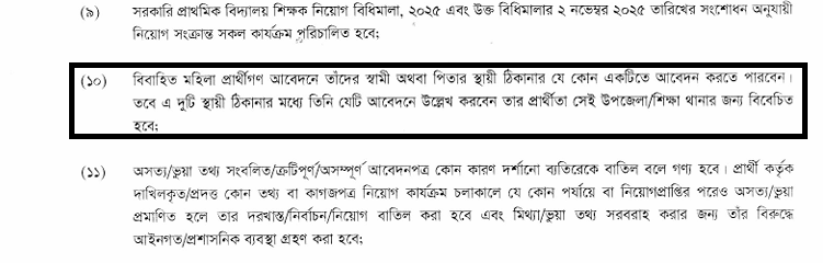 এই বিজ্ঞপ্তিতে ২০টি শর্তবালি যুক্ত করা হয়েছে। এর মধ্যে ১০ নম্বর শর্তে বলা হয়েছে, বিবাহিত নারী প্রার্থীরা আবেদনে তাদের স্বামী অথবা বাবার স্থায়ী ঠিকানার যেকোনো একটিতে আবেদন করতে পারবেন।