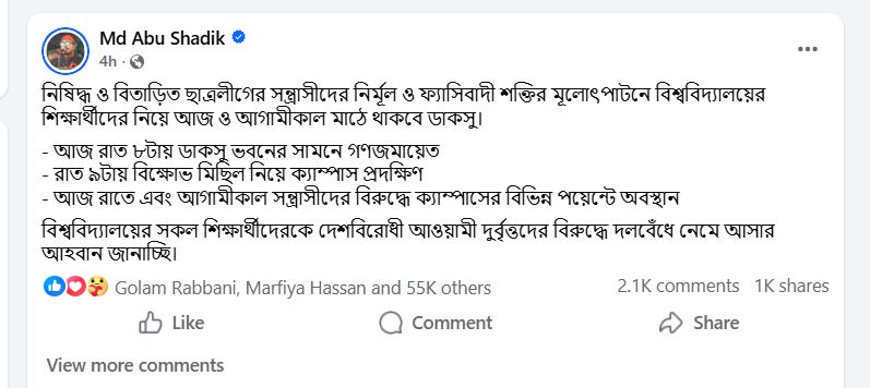 তিনি আরও লেখেন, আজ রাত ৮টায় ডাকসু ভবনের সামনে গণজমায়েত এবং রাত ৯টায় বিক্ষোভ মিছিল নিয়ে ক্যাম্পাস প্রদক্ষিণ করা হবে। এছাড়া আজ রাতে এবং আগামীকাল সন্ত্রাসীদের বিরুদ্ধে ক্যাম্পাসের বিভিন্ন পয়েন্টে অবস্থান নেওয়া হবে।