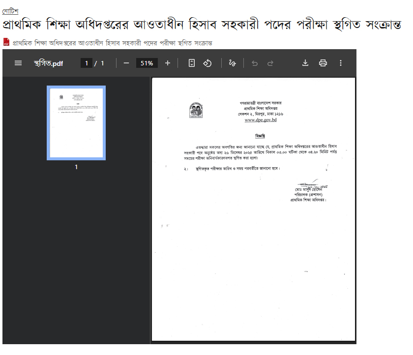 প্রাথমিক শিক্ষা অধিদপ্তরের আওতায় অনুষ্ঠিত হতে যাওয়া হিসাব সহকারী পদের নিয়োগ পরীক্ষা স্থগিত করেছে প্রাথমিক শিক্ষা অধিদপ্তর। অনিবার্য কারণবশত আজকের (শুক্রবার, ২৬ ডিসেম্বর) এ পরীক্ষা স্থগিত করা হয়েছে।