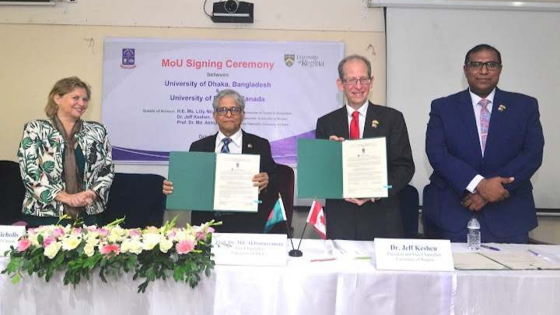 ঢাকা বিশ্ববিদ্যালয়ের উপাচার্য অধ্যাপক ড. মো. আখতারুজ্জামান এবং রিজাইনা বিশ্ববিদ্যালয়ের প্রেসিডেন্ট ও উপাচার্য অধ্যাপক ড. জেফ কেশেন নিজ নিজ বিশ্ববিদ্যালয়ের পক্ষে এই সমঝোতা স্মারকে স্বাক্ষর করেন। এটি কানাডার কোন বিশ্ববিদ্যালয়ের সঙ্গে ঢাকা বিশ্ববিদ্যালয়ের প্রথম সমঝোতা স্মারক। এই সমঝোতা স্মারকের আওতায় ঢাকা বিশ্ববিদ্যালয় এবং রিজাইনা বিশ্ববিদ্যালয় যৌথভাবে শিক্ষা ও গবেষণা কার্যক্রম পরিচালনা করবে।