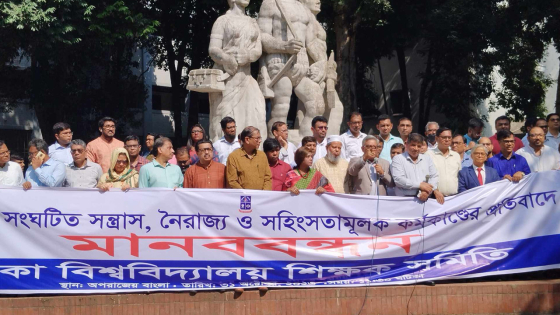 গত ২৮ অক্টোবর দেশব্যাপী বিএনপির নেতাকর্মীদের সন্ত্রাস, নৈরাজ্য ও সহিংসতামূলক কর্মকাণ্ডের প্রতিবাদে মানববন্ধন করেছে ঢাকা বিশ্ববিদ্যালয় (ঢাবি) শিক্ষক সমিতি। এসময় সন্ত্রাস, নৈরাজ্য ও সহিংসতামূলক কর্মকাণ্ড না করে এবং বিদেশি শক্তির সাথে আঁতাত বর্জন করে বিএনপিকে সাংবিধানিক উপায়ে নির্বাচনে আসার আহ্বান জানান তারা।