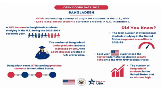 প্রতিবেদনে বলা হয়েছে, ২০২২-২৩ শিক্ষাবর্ষে ১৩ হাজার ৫৬৩ জন বাংলাদেশি শিক্ষার্থী তাদের শিক্ষার জন্য আমেরিকাকে বেছে নিয়েছেন। যুক্তরাষ্ট্রে এ বছর বাংলাদেশি শিক্ষার্থীদের সংখ্যা আগের শিক্ষাবর্ষের (২০২১-২২) চেয়ে ২৮ শতাংশ বেশি এবং সামগ্রিকভাবে বৃদ্ধির ক্ষেত্রে বিশ্বের মধ্যে অন্যতম সর্বোচ্চ। বাংলাদেশি আন্ডারগ্রাজুয়েট বা স্নাতক পর্যায়ের শিক্ষার্থীর সংখ্যাও ৫০ শতাংশের বেশি বেড়েছে। ২ হাজার ৫০০ শিক্ষার্থী আন্ডারগ্রাজুয়েটে (স্নাতক এবং সংশ্লিষ্ট ডিগ্রি) ভর্তি হয়েছে। প্রায় ১০ হাজার বাংলাদেশি স্নাতক শিক্ষার্থী আমেরিকার শিক্ষাপ্রতিষ্ঠানগুলোতে অধ্যয়ন করায় বাংলাদেশ যুক্তরাষ্ট্রে স্নাতক শ্রেণিতে ভর্তির ক্ষেত্রে বিশ্বে সপ্তম স্থানে রয়েছে।