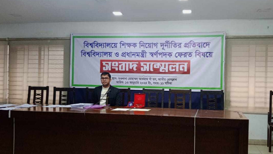 দেশের বিভিন্ন বিশ্ববিদ্যালয়ে শিক্ষক নিয়োগে দুর্নীতি, অনিয়ম ও স্বজনপ্রীতির প্রতিবাদে ‘প্রধানমন্ত্রী স্বর্ণপদক’ প্রত্যাখ্যানের ঘোষণা দিয়েছেন মো. নূরুল হুদা নামে একজন আইনজীবী। তিনি রাজশাহী বিশ্ববিদ্যালয়ের আইন বিভাগ থেকে কৃতিত্বপূর্ণ ফল নিয়ে স্নাতক ও স্নাতকোত্তর শেষ করেছেন।