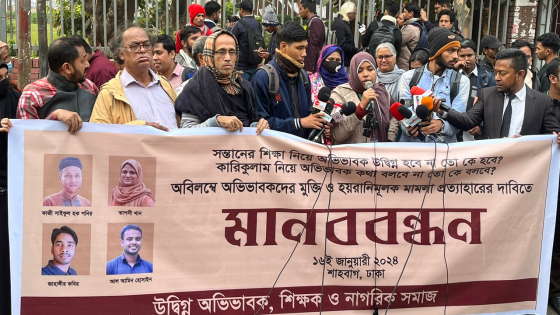 নতুন শিক্ষাক্রম নিয়ে সমালোচনা করায় আটক অভিভাবকদের মুক্তি, মামলা প্রত্যাহার এবং শিক্ষাক্রম বাতিলসহ চার দাবিতে মানববন্ধন করেছে উদ্বিগ্ন অভিভাবক, শিক্ষক ও নাগরিক সমাজ নামক একটি সংগঠন। মঙ্গলবার (১৬ জানুয়ারি) বিকেলে রাজধানীর জাতীয় জাদুঘরের সামনে এ মানববন্ধন অনুষ্ঠিত হয়।