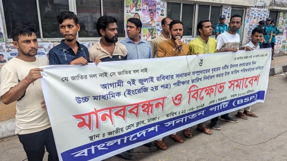 আগামী ৭ জুলাই রথযাত্রার দিন উচ্চ মাধ্যমিক ইংরেজি দ্বিতীয় পত্র পরীক্ষার তারিখ পরিবর্তনের দাবিতে মানববন্ধন ও বিক্ষোভ সমাবেশ করেছে বাংলাদেশ সনাতন পার্টি (বিএসপি)।