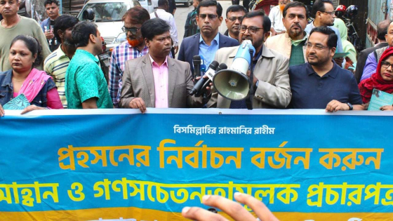 অ্যাডভোকেট তাজুল ইসলাম বলেন, এই নির্বাচন সবদিক দিয়ে অবৈধ ও সংবিধানের লংঘন। যারা এই নির্বাচন প্রক্রিয়ায় যুক্ত তারা জনতার আদালতে দেশদ্রোহী। তিনি দেশবাসীকে এই নির্বাচন প্রত্যাখ্যান ও বর্জন করার আহ্বান জানান।