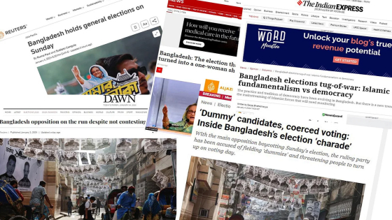 যুক্তরাজ্যভিত্তিক ফিন্যান্সিয়াল টাইমস তাদের প্রতিবেদনে শিরোনাম করেছে, ভোটের মাধ্যমে একদলীয় শাসনে যাওয়ার শঙ্কা বাড়ছে বাংলাদেশে। পাকিস্তানের গণমাধ্যম ডনের প্রতিবেদনে বলা হয়েছে, ‘বাংলাদেশে নির্বাচনে প্রতিদ্বন্দ্বিতা না করেও দৌড়ের ওপর রয়েছেন বিরোধীরা। এতে আরও বলা হয়, বিরোধীদের ওপর দমনপীড়ন চালানো হচ্ছে বলে অভিযোগ করেছে আন্তর্জাতিক মানবাধিকার সংস্থা অ্যামনেস্টি ইন্টারন্যাশনাল ও হিউম্যান রাইটস ওয়াচ (এইচআরডব্লিউ)। তবে তা প্রত্যাখ্যান করে প্রধানমন্ত্রী শেখ হাসিনা ও তার দল আওয়ামী লীগ বারবার বলেছে, নির্বাচন বানচাল করতে প্রতিবন্ধকতা সৃষ্টি করছে বিএনপি।