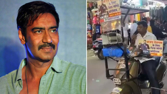 স্কুটিতে মাইক লাগিয়ে প্ল্যাকার্ড হাতে বসে আছেন এক ব্যক্তি। প্ল্যাকার্ডে বলিউড অভিনেতা অজয় দেবগনের ছবি। তাতে লেখা, ‘অজয় দেবগনের জন্য ভিক্ষার আন্দোলন।’