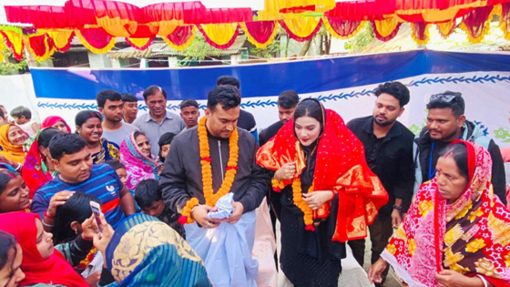বালিয়াঘাটি কুমারপাড়া গ্রামের সনাতন ধর্মাবলম্বীরা উলুধ্বনি দিয়ে এবং লাল বেনারসিতে জড়িয়ে বরণ করে নিয়েছেন মাহিয়া মাহিকে। ধুতি জড়িয়ে বরণ করে নিয়েছেন নায়িকার স্বামী রকিব সরকারকেও। দুজনের গলায় ও হাতে গাঁদা ফুলের মালা পরিয়ে দিয়েছেন তারা।