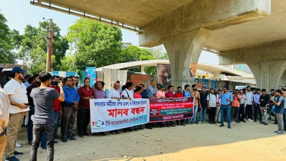 মানববন্ধনে বিএফইউজের সভাপতি ওমর ফারুক, মহাসচিব দীপ আজাদ, ডিইউজের নবনির্বাচিত অন্যতম সভাপতি সাজ্জাদ আলম তপু, সোহেল হায়দার, সাংগঠনিক সম্পাদক গোলাম মুজতবা ধ্রব, বাচসাসের সভাপতি রিমন মাহফুজ, সাবেক সাধারণ সম্পাদক কামরুজ্জামান বাবু প্রমুখ উপস্থিত ছিলেন।