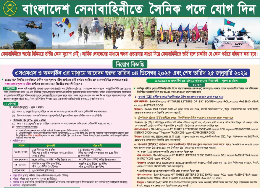 জনবল নিয়োগের জন্য বিজ্ঞপ্তি প্রকাশ করেছে বাংলাদেশ সেনাবাহিনী। ‘সৈনিক’ পদে জনবল নেবে বাহিনীটি। আগ্রহী প্রার্থীরা অনলাইনের মাধ্যমে আগামী ২৫ জানুয়ারি (২০২৬ ইং) পর্যন্ত আবেদন করতে পারবেন।
