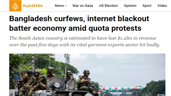 ব্যবসায়ী নেতাদের বরাত দিয়ে আল-জাজিরা জানায়, গেল পাঁচ দিনে শুধু পোশাক ও স্টিল খাতসহ আরও তিন খাতে বাংলাদেশের আর্থিক ক্ষতি হয়েছে এক দশমিক দুই বিলিয়ন মার্কিন ডলার, যা বাংলাদেশি মুদ্রায় ১৪ হাজার কোটি টাকার বেশি।
