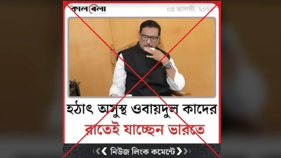 সম্প্রতি আওয়ামী লীগের সাধারণ সম্পাদক এবং সড়ক পরিবহন ও সেতুমন্ত্রী ওবায়দুল কাদেরকে জড়িয়ে ফটো কার্ড এডিট করে গুজব ছড়ানো হচ্ছে। যে কার্ডে বলা হচ্ছে ‘হঠাৎ অসুস্থ ওবায়দুল কাদের, রাতেই যাচ্ছেন ভারতে’, মূলত এটি একটি ভুয়া ফটো কার্ড। কালবেলা এ ধরনের কোনো নিউজ বা ফটো কার্ড করেনি।