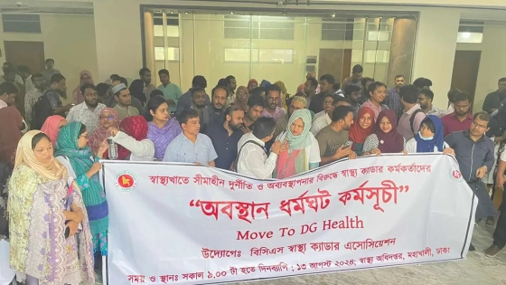 সারা দেশের সব পর্যায়ে স্বাস্থ্য খাতে দুর্নীতিবাজ কর্মকর্তাদের পদত্যাগ ও বিচারের দাবিতে স্বাস্থ্য অধিদপ্তরে সামনে অবস্থান ধর্মঘট ও বিক্ষোভ কর্মসূচি পালন করেছে বিসিএস স্বাস্থ্য ক্যাডার অ্যাসোসিয়েশন।