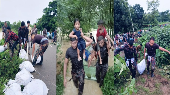 বর্ডার গার্ড বাংলাদেশ (বিজিবি) দেশের বন্যাদুর্গত জেলাগুলোর ক্ষতিগ্রস্তদের মধ্যে ত্রাণসামগ্রী বিতরণ এবং চিকিৎসাসেবা অব্যাহত রেখেছে। এখন পর্যন্ত বন্যাদুর্গত এলাকার ২ হাজার ৯১৪ জনকে উদ্ধার ও ৬৩ হাজার ৭১৪টি পরিবারের মধ্যে ত্রাণসামগ্রী বিতরণ এবং ২৩ হাজার ৩১১ জন রোগীকে বিনামূল্যে চিকিৎসাসেবা ও ওষুধ দেওয়া হয়েছে।