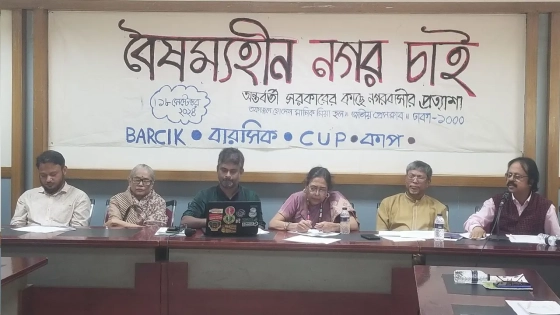 বুধবার (১৮ সেপ্টেম্বর) জাতীয় প্রেস ক্লাবে ‘সবার জন্য চাই বৈষম্যহীন নগর, অন্তর্বর্তী সরকারের কাছে নগরবাসীর প্রত্যাশা’ শীর্ষক মতবিনিময় সভায় এ সব কথা বলেন বক্তারা। বেসরকারি গবেষণা প্রতিষ্ঠান বারসিক ও কোয়ালিশন ফর দ্য আরবান পুওর (কাপ) আয়োজিত ওই সভায় সভাপতিত্ব করেন কাপের নির্বাহী পরিচালক খন্দকার রেবেকা সান ইয়াত।