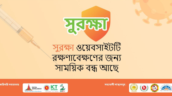 কারিগরি রক্ষণাবেক্ষণের জন্য সাময়িক বন্ধ আছে করোনা টিকা নিবন্ধন ও সনদপত্র নেওয়ার ওয়েবসাইট সুরক্ষ ডটগভডটবিডি। ওয়েবসাইটটিতে বিভিন্ন কারিগরিবিষয়ক হালনাগাদের কাজ চলছে।